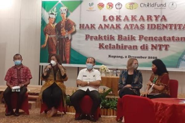 Direktur ChildFund Internastional, Hanneke Oudkerk didampingi Child Protection dan Advoksi Spesialis, Renny Haning, Wakil Ketua DPRD NTT, Dr, Inche Sayuna, Kabid Pendudukan Pencatatan Sipil Dinkes NTT, Hendrik Manesi dan Kabid Pelayanan Pencatatan Sipil Disdukcapil Belu, Maksimus Mau memberi keterangan pers pada acara Lokakarya Hak Anak Atas Identitas yang diinisiasi ChildFund, di Kupang, Rabu (2/12) malam.