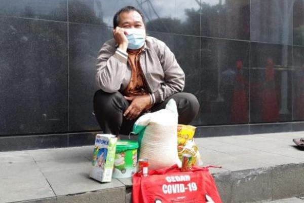 Boyamin saat menyerahkan contoh sembako dari bansos covid-19 ke KPK