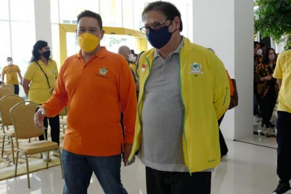 Ketua Umum PPK Kosgoro 1957 Dave Laksono bersama Ketua Umum DPP Partai Golkar Airlangga Hartarto saat meninjau acara program vaksinasi Covid-19 yang diselenggarakan Partai Golkar dan Kosgoro 1957 di Kantor DPP Partai Golkar, Jakarta, Minggu (25/4).