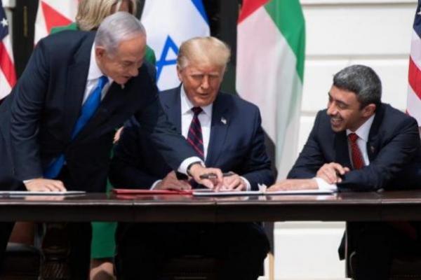 Perdana Menteri Israel Benjamin Netanyahu (kiri), mantan Presiden AS Donald Trump, dan Menteri Luar Negeri UEA Abdullah bin Zayed Al-Nahyan (kanan) tersenyum saat mereka berpartisipasi dalam penandatanganan Perjanjian Abraham di mana negara-negara Bahrain dan Uni Emirat Arab mengakui Israel, di Gedung Putih di Washington, DC, 15 September 2020 [SAUL LOEB / AFP