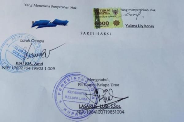 Salah satu surat penyerahan hak atas tanah (PH) dari Juliana Lily-Konay, selaku pihak yang kalah dalam perkara perebutan warisan ditandangani Lurah Oesapa Kiah Kia dan Plt Camat Kelapa Lima Lasarus Lusi padahal belum ditandatangani pihak pembeli. Selain itu, surat PH ini pun tanpa no registrasi dan tanpa tandatangan Kasie Tatapem Kantor Kecamatan Kelapa Lima.