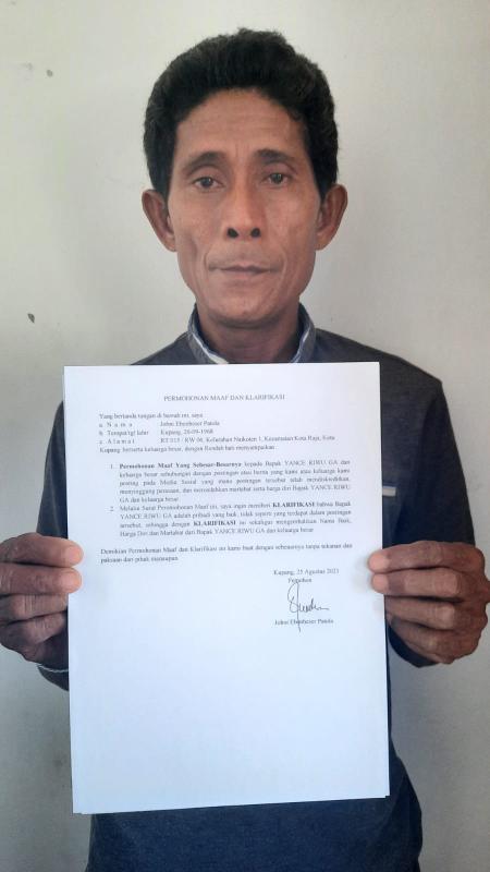 "Kedua, melalui surat peromohnan maaf ini, saya ingin memberi klarifikasi bahwa bapak Yance Riwu Ga adalah pribadi yang baik, tidak seperti yang terdapat dalam postingan tersebut, sehingga dengan klarifikasi ini sekaligus mengembalikan nama baik, harga diri dan martabat dari bapak Yance Riwu Ga dan keluarga besar," tulis Johni Patola.
