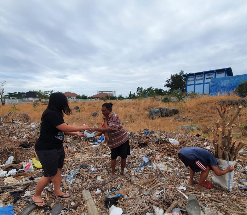 Siswa SMA Kolose Debrrito Yogjakarta, Tistan Cakratiananta Binti memberikan nasi bungkus kepada salah seorang pemulung di Kota Kupang.