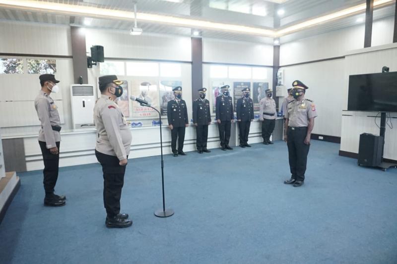 Kapolres Kupang Kota AKBP Satrya Perdana P Tarung Binti memandu upacara kenaikan pangkat anggota Polres Kupang Kota yang berhasil mengungkap peredaran uang palsu