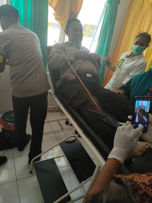Salah seorang anggota Polres Flores Timur yang terkena anak panah sementara mendapatkan pertolongan di Puskesmas Baniona.