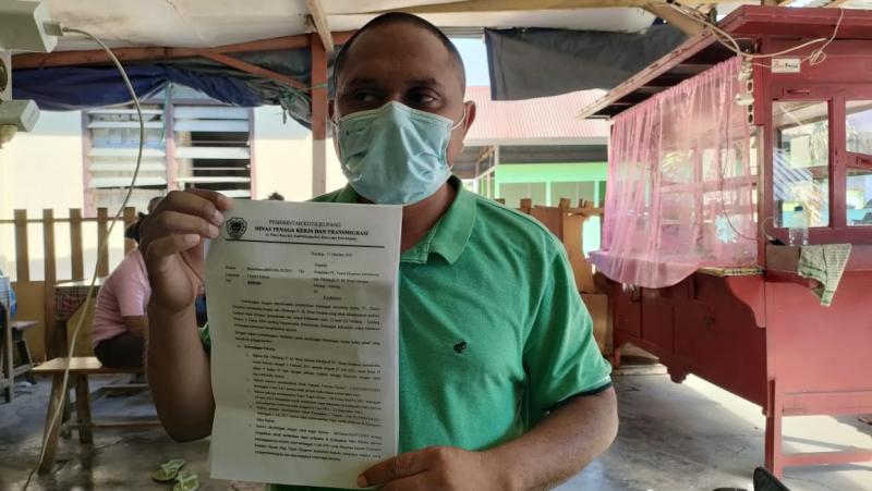 Obet Gerimu menunjukkan surat anjuran dari Dinas tenaga Kerja Kota Kupang yang berbeda dengan LBH Pers Jakarta soal PHK terhadapnya oleh manajemen harian timex.