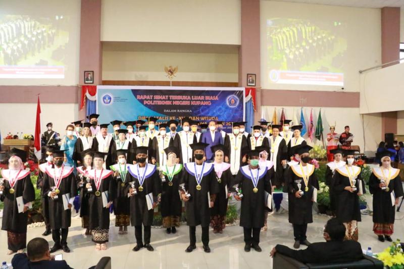 Gubernur NTT, Viktor Bungtilu Laiskodat foto bersama senat dan wisudawan saat menghadiri Rapat Senat Terbuka Luar Biasa Politeknik Negeri Kupang Dalam Rangka Dies Natalis ke-XVII dan Wisuda Sarjana Terapan serta Ahli Madya tahun 2021 di Auditorium Kampus Politeknik Negeri Kupang.