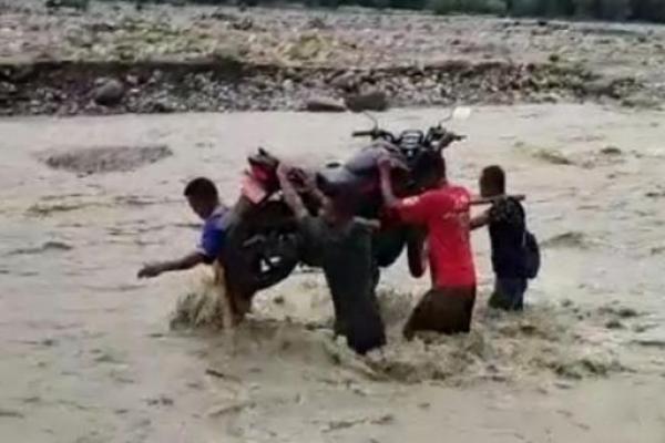 Warga mencari kayu dan menandu sepeda motor kepala desa. Sementara kepala desa pun menanggalkan pakaian dinas dan dipikul warga guna menyusuri sungai melewati banjir.