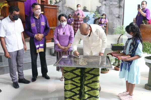 Gubernur NTT, Viktor Bungtilu laiskodat menandatangani prasasti sebagai tanda meresmikan Gedung Kebaktian Jemaat GMIT Pniel Manutapen Kota Kupang di Kelurahan Manutapen Kecamatan Alak, Kota Kupang, Minggu (6/3/2022)