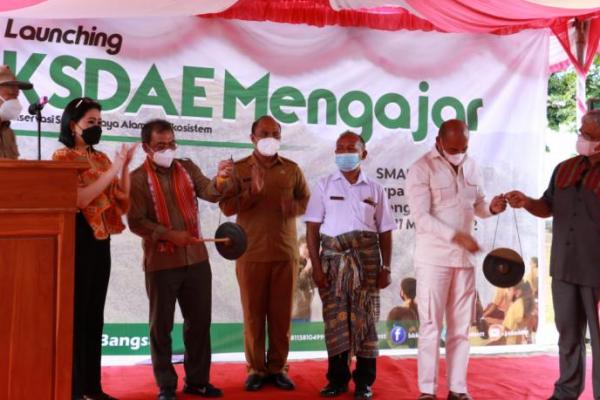 Gubernur NTT, Viktor Bungtilu Laiskodat bersama Direktur Jenderal (Dirjen) Konservasi Sumber Daya Alam dan Ekosistem (KSDAE) Kementerian Lingkungan Hidup dan Kehutanan, Wiratno memukul gong sebagai tanda melaunching Program KSDAE Mengajar.