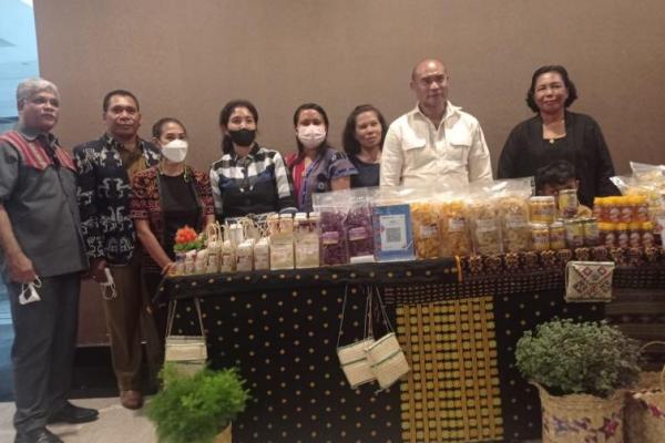 Gubernur NTT, Viktor Bungtilu Laiskodat bersama salah satu UMKM binaan Bank NTT saat peluncuran iven berskala nasional yakni Festival Desa Binaan Bank NTT dan Festival PAD dirangkai dengan Program Ramai Skali tahun 2022 di Aston Hotel Kupang, Senin (21/3/2022).
