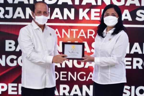 Kepala BNPT, Komjen Pol Boy Rafli Amar memberikan cinderamata kepada Direktur Utama PT. Pelni (Persero), Tri Andayani saat Perjanjian Kerja Sama (PKS) antara BNPT dan PT Pelni.