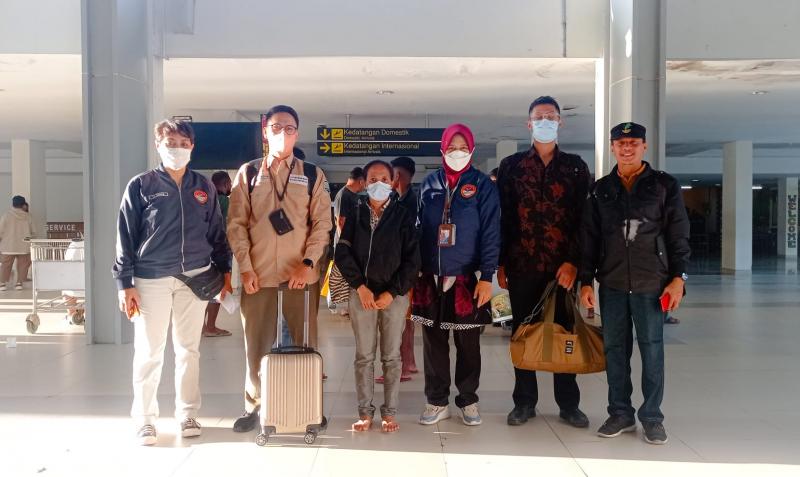 Dua petugas dari Kementerian Luar Negeri mengantar Welmince Alunat dengan pesawat Batik Air dari Jakarta dan tiba di Bandara El Tari Kupang, Sabtu (26/3/2022) lalu.