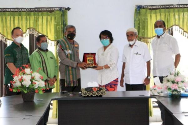 Kapolda NTT, Irjen Pol Setyo Budiyanto bertukar cinderamata Ketua FKUB Provinsi NTT Yuliana Salosso usai bersilaturahmi dan tatap muka bersama pengurus Forum Kerukunan Umat Beragama Provinsi Nusa Tenggara Timur.