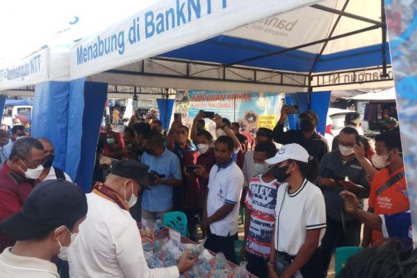 Gubernur NTT, Viktor Bungtilu Laiskodat didampingi Bupati Lembata, Thomas Olla, Sekda NTT, Benediktus Polomaing dan Dirut Bank NTT, Harry Alexander Riwu Kaho mengunjungi stand UMKM Binaan Bank NTT di Pasar Pada Lewoleba.