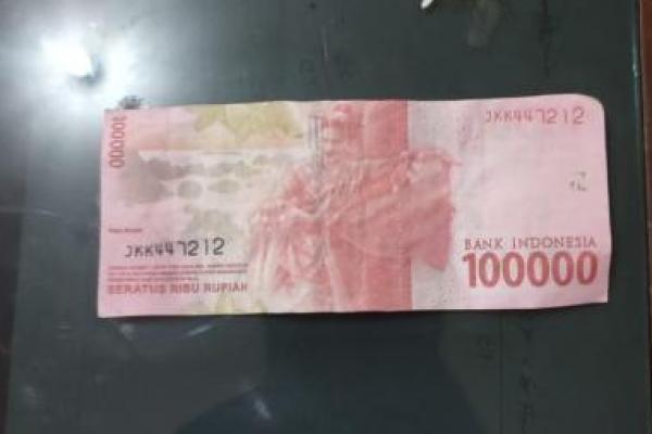 Ciri-ciri uang palsu yang terselip diantara uang dan digunakan untuk berbelanja di toko Taruna Jaya adalah pecahan Rp 100.000, dengan nomor seri JKK447212.