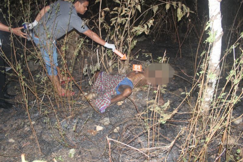Ia kaget melihat korban dalam posisi terlentang dalam kebun yang terbakar berjarak 4 meter dari jalan raya.
