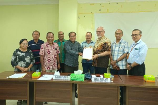 Ketua BMPS NTT, Winston Rondo bersama pengurusnya lainnya menyerahkan data permasalah sekolah swasta di NTT kepada Senator Paul Liyanto dalam pertemuan yang digelar di Kantor Dewan Perwakilan Daerah (DPD) NTT di Jalan Polisi Militer Kupang, Senin (10/10/2022).