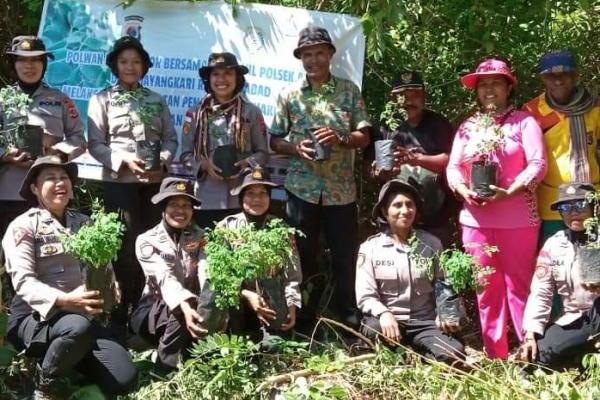 Polisi wanita (Polwan) Polres Alor, dipimpin Kapolsek Alor Barat Daya, Iptu Jean Sakala melakukan penanaman 20.000 anakan kelor di Desa Kuifana Kecamatan Abad Selatan Kabupaten Alor, Jumat (9/12/2022).