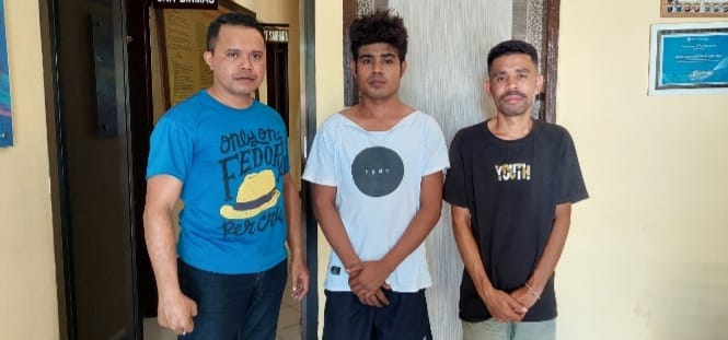 KATANTT.COM--Paul Ronaldo Buling (24), mahasiswa semester VIII Fisip Unwira Kupang dan Ferdi Lasarus Mael (27), mahasiswa penghuni Asrama Pemda Alor-Kupang diamankan anggota Polsek Kelapa Lima, Jumat (24/3/2023).