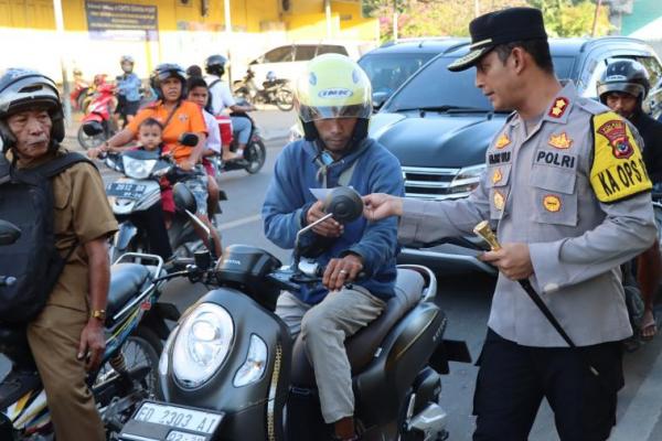 Kapolres Sumba Timur AKBP Fajar Widyadharma LS versama jajarannya saat turun ke jalan memberikan himbauan dan pamflet berisi surat imbauan kepada seluruh masyarakat Sumba Timur di Kota Waingapu, Selasa (6/6/2023).