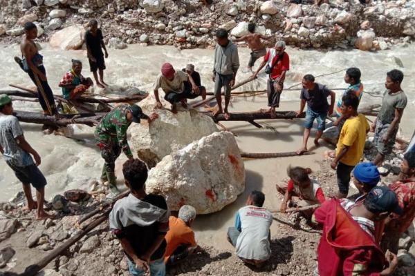 Warga Desa NUnbena sementara melakukan evakuasi terhadap jenasah korban yang tertindih batu saat terseret banjir di sungai Nunbena, Kamis (6/7/2023).