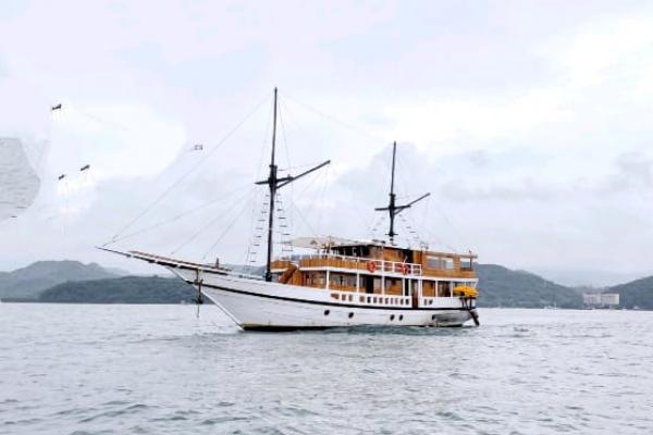 Kapal Phinisi KLM Dragonet 01 yang mengamali patah kemudi beberapa waktu di labuan bajo