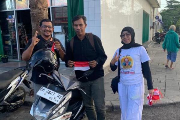 Relawan Teman Jeriko saat membagikan bendera merah putih kepada salah satu pemngendara sepeda motor, Rabu (16/08/2023).
