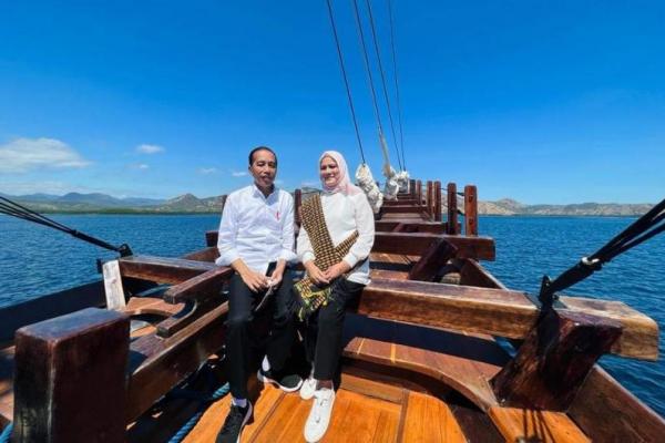 Presiden Jokowi dan Ibu Negara Iriana Jokowi di atas kapal pinisi saat berkunjung ke Pulau Rinca-Labuan Bajo beberapa waktu lalu..