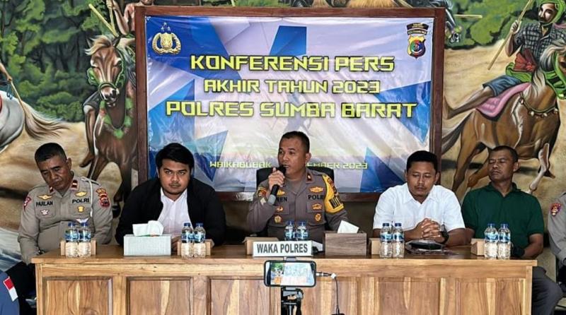 Wakapolres Sumba Barat, Kompol Lorensius saat menggelar jumpa pers terkait kasus kriminal dan lakalantas selama tahun 2023 di Mako Polres Sumba Barat.