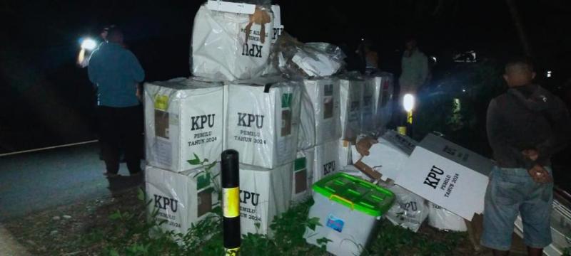 Ada 35 kotak suara dan logistik Pemilu yang diangkut yakni 30 buah kotak kondisi baik, 3 kotak kondisi rusak ringan dan dua buah kotak rusak berat.