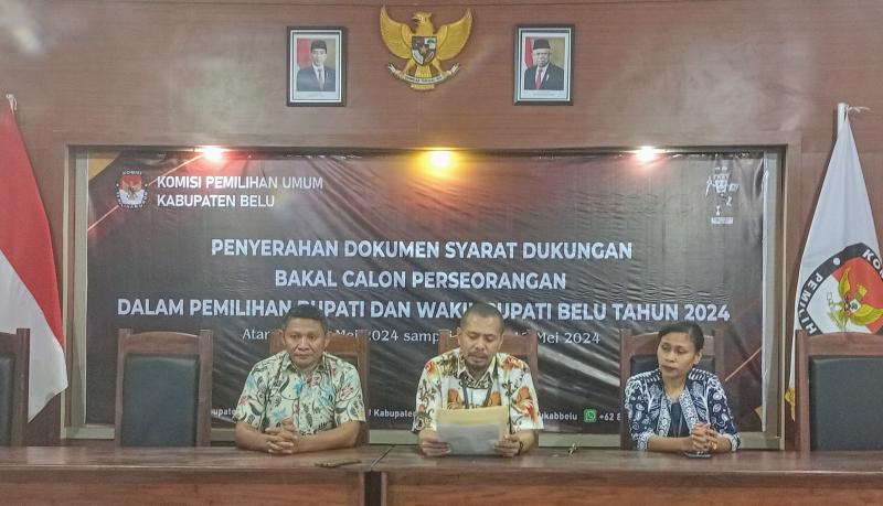 "Penyerahan dokumen syarat dukungan pasangan calon perseorangan dalam Pemilihan Bupati dan Wakil Bupati Belu tahun 2024 kepada KPU Kabupaten Belu dilaksanakan tanggal 8 Mei sampai dengan tanggal 12 Mei 2024 bertempat di Kantor KPU Kabupaten Belu," ujar dia didampingi anggota Komisioner.