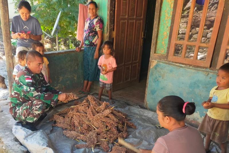 Demikian Sertu Asten saat membantu masyarakat membersihkan hasil panen sorgum atau yang lebih dikenal dengan nama jagung Rote di Dusun Mukloi, Desa Kewar, Kecamatan Lamaknen, Kabupaten Belu Perbatasan RI-RDTL Rabu (5/6/2024) kemarin.