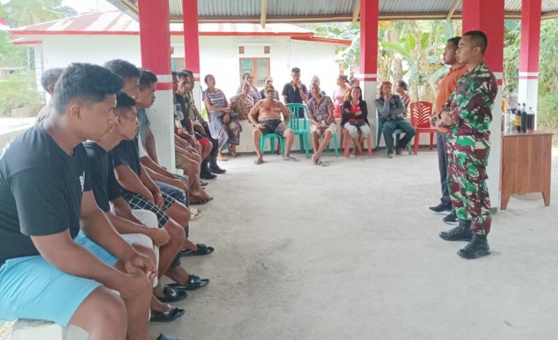 Danpos Turiskain Satgas Yonif 742/SWY, Sertu Ahmad Hanavy Satria saat memberikan nasihat kepada warga usai damaikan pertikian antar warga di Desa Maumutin, Kecamatan Raihat, Kabupaten Belu, Selasa (2/7/2024).