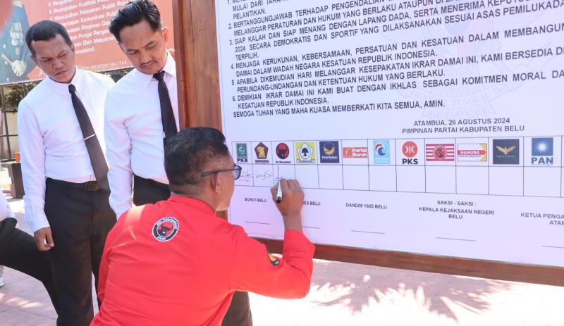Pengurus Parpol (DPC PDIP) Kabupaten Belu menandatangani deklarasi pemilu damai digelar Polres Belu bertempat di lapangan apel Mapolres Belu wilayah perbatasan RI-Timor Leste, , Senin (26/8/2924)