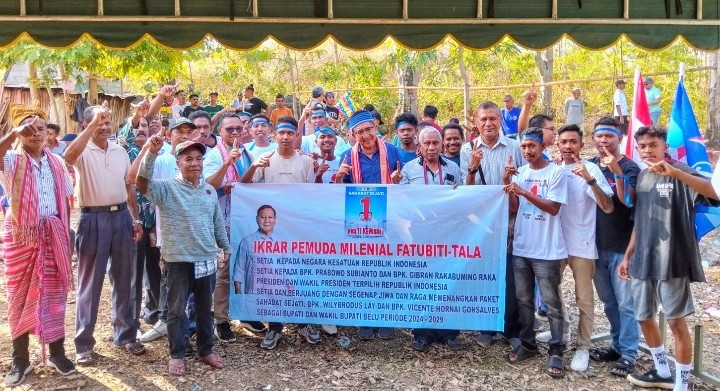 Salah satunya dukungan dari pemuda-pemudi Fatubiti, Desa Tukuneno dal ikrar milenial yang dibacakan salah seorang pemuda, Ano dalam kampanye paket Sahabat Sejati bersama tim pemenangan di Tala, Kabupaten Belu perbatasan RI-RDTL, Rabu (2/10/2024).
