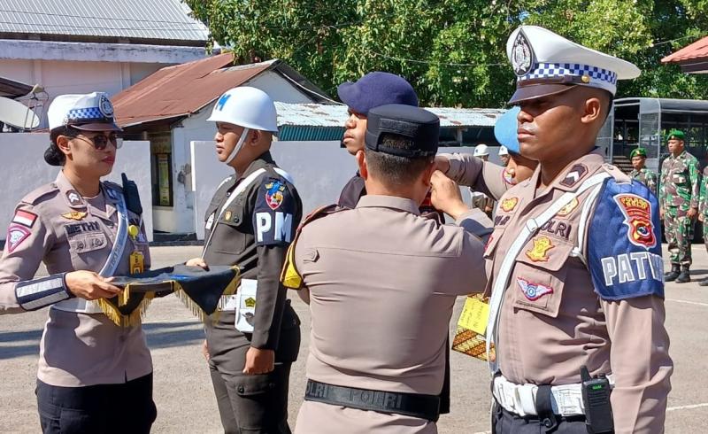 Wakapolres Belu, Kompol Lorensius sematkan pita kepada perwakilan personel dalam apel gelar pasukan operasi Zebra Turangga 2024 di halaman Mapolres Belu perbatasan RI-RDTL, Senin (14/10/2024)