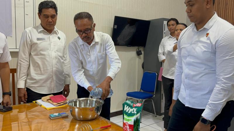 Pemusnahan dilakukan dengan cara memasukkan barang bukti sabu ke dalam wadah berisi air yang kemudian dicampurkan dengan cairan pembersih lantai, guna memastikan narkotika tersebut tidak dapat disalahgunakan lagi.
