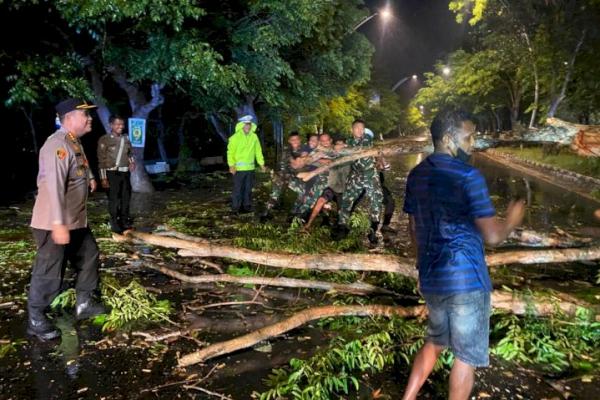 Kota Kupang dan juga PLN, Kapolresta bersama Dandim turun langsung membantu mengangkat dahan-dahan yang patah dan dedaunan yang menutupi badan jalan.