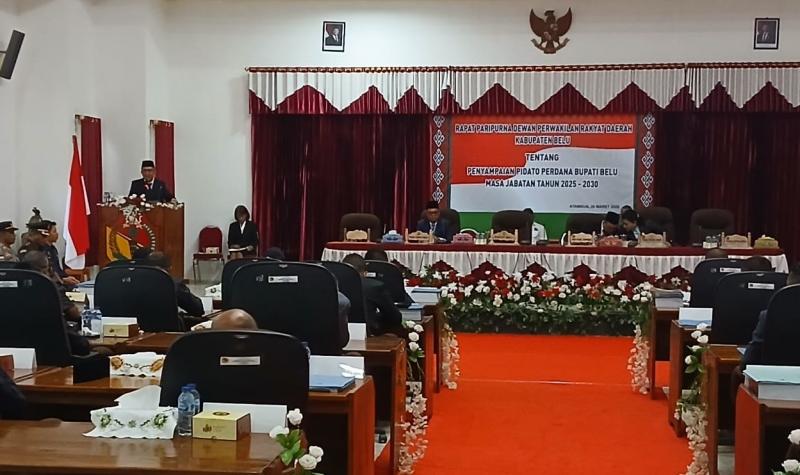 KATANTT.COM---Bupati Belu, Willybrodus Lay menyampaikan pidato sambutan pertamanya usai dilantik dalam Rapat Paripurna yang digelar di ruang sidang DPRD Belu, Kabupaten Belu perbatasan RI-RDTL, Rabu (26/3/2025).