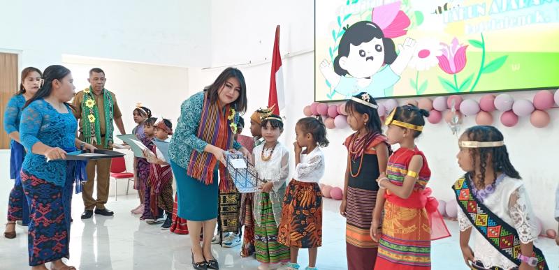 KATANTT.COM---Bunda PAUD Kabupaten Belu, Ny. Lidwina Vivi Ng Lay kembali melepas 146 anak PAUD dan TK dari wilayah PKG Lau Siberu, Kecamatan Atambua Barat, Kabupaten Belu perbatasan RI-RDTL, Senin (16/6/2025).