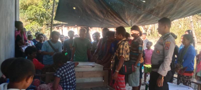 Kasat Reskrim Polres Kupang Iptu Yeni Setiono dan Kapolsek Amfoang Selatan Ipda Chemy Toleu melayat ke rumah duka usai olah TKP kebakaran rumah yang menewaskan dua bocah sekaligus memberikan bantuan tali kasih dari Kapolres Kupang