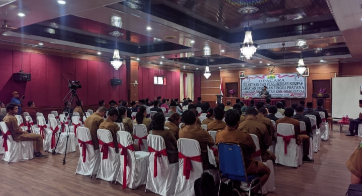 Para Aparatur Sipil Negara (ASN) menghadiri upacara pelantikan dan pengambilan sumpah jabatan pimpinan tinggi pratama (eselon II) lingkup Pemerintah Kabupaten Manggarai yang dipimpin Bupati Manggarai, Herybertus G.L. Nabit, di Ruteng, Senin (1/9/2025).