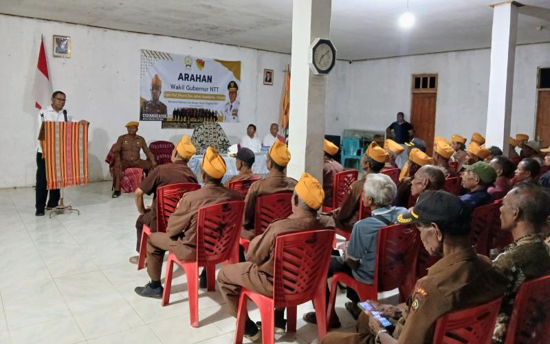 Wakil Gubernur NTT, Johni Asadoma saat memberikan arahan kepada veteran di Kantor Macab LVRI Belu di Kimbana, Kabupaten Belu perbatasan RI-RDTL, Rabu (24/9/2025).