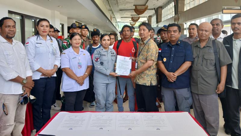 Bakamla Kupang jemput pemulangan enam nelayan asal Indonesia terdampar di Timor Leste yang diserahkan oleh KBRI Timor Leste di PLBN Motaain, Kabupaten Belu perbatasan RI-RDTL, Rabu (7/1/2026).